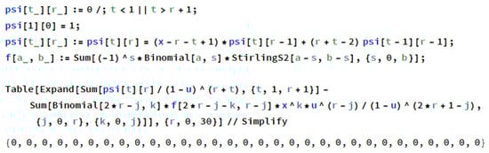 A Mathematica code verifying that Equation (5) holds for integers is provided in Figure 3. The first two lines define and , respectively. The third line represents the recursion formula for as given by Equation (4). The fourth line defines the function similar to that in Equation (9). The fifth line involves the calculation of the difference between the left- and right-hand sides of Equation (5), stepping through from 0 to 30 with increasing execution time needed for higher recursion levels. Note that the right-hand side here is expressed via the use of Equation (9). The output is as desired, an array of zeros, showing that, for each considered value of , the conjectured identity holds true.