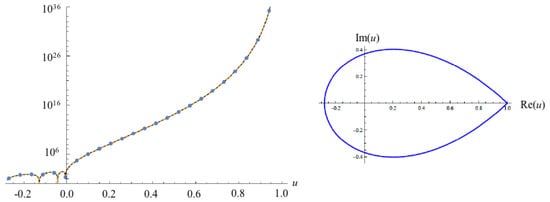 (Left) LHS of Equation (5) (orange), RHS of Equation (5) (black dashed) and computed LHS of Equation (1) (blue points) for , and varying . (Right) Region of complex plane, where the series on the LHS of Equation (1) converges and where Equation (1) holds true (see Equation (11)).