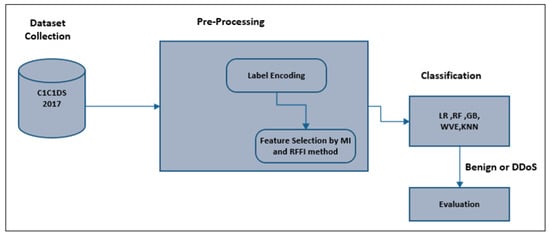 In this section, the steps of the proposed methodology for DDoS attack detection are discussed. In the first step, we extract the CICIDS 2017 [] and CICDDoS 2019 [] datasets. The preprocessing of a dataset is performed in the second step. In the third step, we apply machine learning techniques for the classification of DDoS attacks. Finally, we evaluate the performance of our method, by different evaluation metrics. Figure 1 shows the workflow of the proposed methodology for DDoS attack detection. Each phase of the proposed method is explained in the following subsections.