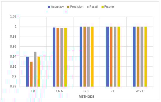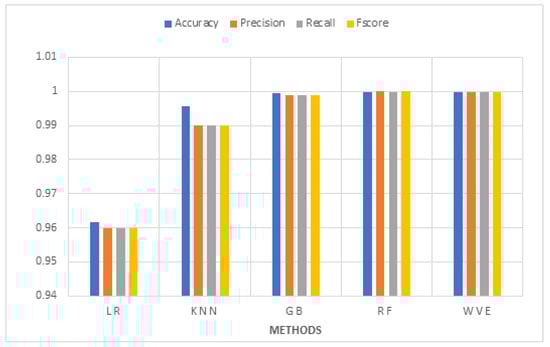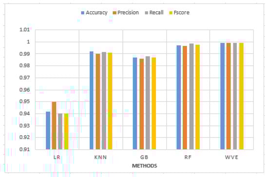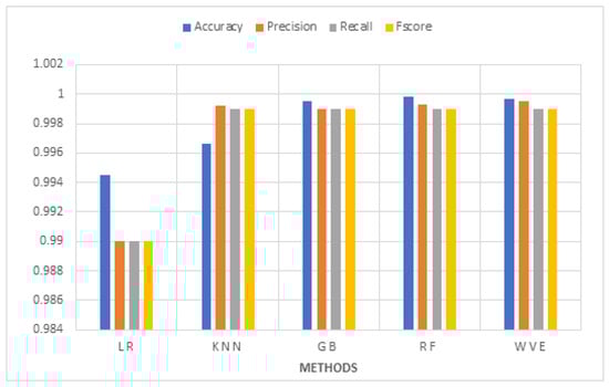 Figure 2 shows the results of various methods, in DDoS attack detection with 16 features. Sixteen features were selected from the in-hand dataset, using MI and applied machine learning methods, on selected features. RF and WVE methods have the highest prediction accuracy, compared to other methods. All these methods have 99% accuracy and other matrix values. In the case of large datasets, only the measurement of accuracy is not sufficient to measure the performance of the model, since the miss classification of some data points does not affect the accuracy.