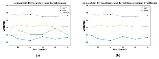 Schematic diagram of MMDMDS between each target domain and miniImagenet under different shot numbers: (a) MMDMDS between four target domain datasets and miniImagenet. (b) MMDMDS between target domain and miniImagenet except CropDisease