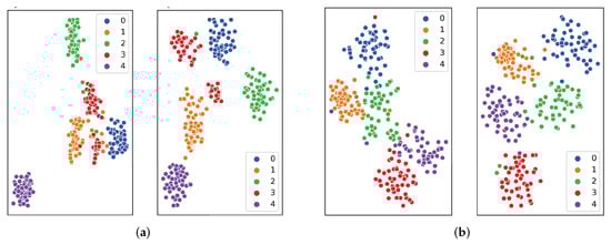 t-SNE visualization of CropDisease and EuroSAT before and after feature distribution transformation. The left side of each subfigure is untransformed, and the right side is transformed. (a) CropDisease. (b) EuroSAT.