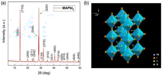 The PXRD pattern of the MAPbI3 single crystal powder is presented in Figure 2a. It shows that the main peaks were at 2θ = 14.1°, 28.4°, and 31.9°, which could be assigned to the (110), (220), and (310) lattice planes of the lower-symmetrical tetragonal structure, respectively, (space group I4/mcm, a = b = 8.8725 Å and c = 12.547 Å) at room temperature, according to the results reported in the literature for powder samples [27,28,29,30]. The clear split of the (220) and (004) peaks further affirmed that the as-synthesized MAPbI3 single crystal adopted a tetragonal phase with a high crystalline quality [27,29]. The crystals can be conceived as a methylammonium ion (MA+) contained in an (inorganic) framework of a corner-sharing PbI63− octahedral, as shown in Figure 2b [31,32].