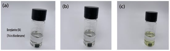 The pristine MAPbI3 single crystal without polishing was then submerged in the BA ligand solution for a period of time (as shown in Figure 3). The BA ligand solution was initially clear and transparent, and there was no significant change after 60 s of immersion. After 3 h of the soaking process, the BA solution turned pale yellow, as shown in Figure 3c.