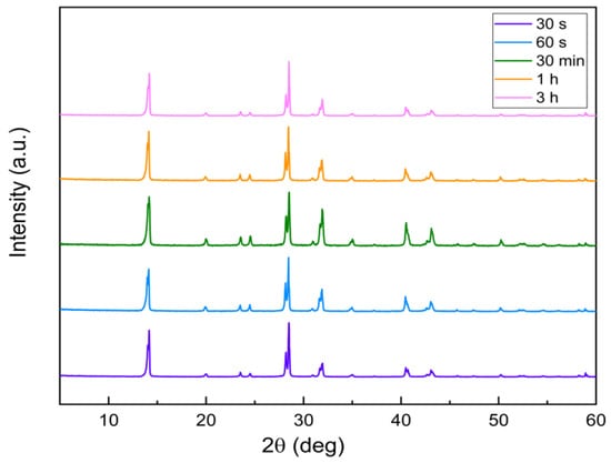 Figure 4 shows the PXRD patterns of the MAPbI3 samples after the BA treatment for 30 s (purple line), 60 s (blue line), 30 min (green line), 1 h (orange line), and 3 h (pink line). There was no discernible difference in PXRD before and after passivation, which could be attributed to the surface passivation layer’s low component content, which could not be detected by an XRD measurement.