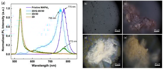 Figure 5 demonstrates the PL spectra of the PSC surface before and after BA treatment, and the corresponding optical microscopy images. The blue dot in the optical microscopy images (as shown in Figure 5b–e) is the position of the sample surface irradiated by the focused laser light source during PL measurement. The pristine PSC sample (purple line) exhibited a symmetric emission spectrum at the excitation of 775 nm (1.60 eV). After the BA ligand treatment, several different types of capping layer samples coexisted on the different positions of the treated 3D MAPbI3 single crystal surface. As shown for the 2D-type samples (orange line) in Figure 5a, the sample mainly exhibited a single fluorescence peak around 533 nm (2.33 eV). This emission feature suggested the existence of a pure 2D perovskite (BA)2PbI4, which exhibited a long, asymmetric tail extending toward a longer wavelength (lower energy side), possibly due to the self-trapped exciton [33] or the disordered structure [34]. This result implied that the BA treatment assisted the MAPbI3 conversion into (BA)2PbI4. The 2D/3D-type mixed-phase layer (green line) was also found in another position on the BA-treated surface, and showed the 2D (n = 1) and 3D PL peaks obviously separated from each other, which was ascribed to the excitonic band-edge emissions of 2D and 3D perovskites and coincided well with the previous findings [35]. In addition, multiple Q-2D perovskite phases simultaneously existed because multiple PL peaks for 2D/Q-2D/3D could be found (Figure 5a blue line), although nominally prepared as n = 1 because it is well-known that n = 1 nanoplatelets (pure 2D perovskite materials) possess larger formation energy than Q-2D. More importantly, the blue shift of 19 nm for the 3D perovskite PL peak suggested the occurrence of defect passivation on the perovskite surface [36].