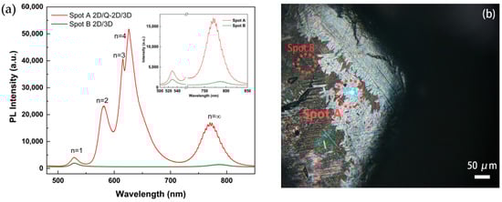 (a) PL spectra comparison of a 2D/Q-2D/3D spot (red line) and a 2D/3D spot (green line); inset: intercepted 2D and 3D peaks for comparison; (b) optical microscopy image of a 60 s BA-treated PSC edge.