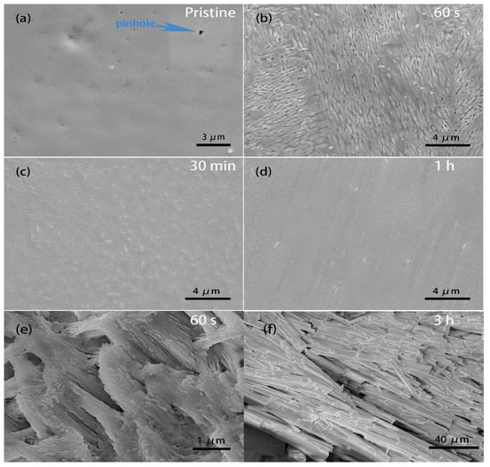 In order to further observe the passivation process, the typical surface morphology changes in MAPbI3 single crystals, treated by BA at different times, were compared by SEM, as shown in Figure 8. The morphology of pristine MAPbI3 is shown in Figure 8a, in which there are some visible pinholes (scattered dark dots) and a few small particles on the surface, which might have resulted from the partial decomposition of the PSC surface because of contamination through the attachment of the nonstoichiometric precursors when removing the PSCs out of the super-saturated precursor solution [28]. After exposure to BA, the morphology of the perovskite surface was obviously affected, as shown in Figure 8b–f. The reaction started with the formation of small, layered crystallites over the surface (Figure 8b,e). As time elapsed, these layered crystallites tended to spread and merge in contact with each other (Figure 8c). After deliberately prolonging the BA treatment time to 1 h for a sufficient reaction of the whole surface, the typical morphology of the ultimate surface showed a newly formed, more uniform, and smoother crystal surface (Figure 8d). Instead, the surface became rough after the 3 h BA treatment because there were many needle-like aggregates on the single crystal surface (Figure 8f), and the solution simultaneously became pale yellow, as shown in Figure 3c. We supposed that lead iodide was formed.