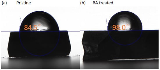 The surface wettability is critical for the moisture stability of high-quality MAPbI3 SC devices. To examine the influence of BA treatment on the surface wettability, we observed the water contact angle change of SCs with BA treatment. As shown in Figure 9a, the contact angle of the pristine SC surface was 84.5°. The contact angle of the pristine PSC was larger than that of the conventional polycrystalline perovskite films because the single crystal had a compact structure, no grain boundary, and high crystallinity, resulting in an enhanced moisture stability compared with polycrystalline films. As shown in Figure 9b, the contact angle of the 1 h BA-treated SC surface was 98.0°, which was much larger than that of the pristine SC. This increase in the contact angle could be attributed to the improved morphology quality of the perovskite SC surface, as demonstrated by the SEM characterization, which prevented H2O intake. The 2D perovskites had better moisture resistance than 3D perovskite materials due to their enhanced hydrophobicity and high formation energy [40,41], which could also improve the moisture resistance of the PSC. Thus, the BA treatment can increase the hydrophobicity of SC, which is expected to benefit the stability and formation of high-quality PSC devices.