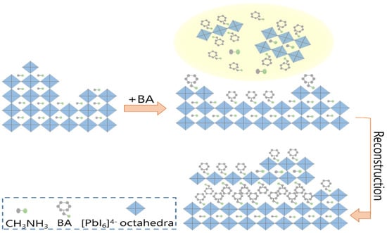 where MA+ and BA+ denote the protonated ion, that is, the ammonium forms of methylamine and BA, respectively. The basic mechanisms that we speculated as being involved in the surface passivation of MAPbI3 PSC by BA are depicted schematically in Figure 10. Previous reports had shown that the basic N atom with an electron lone pair in alkylamine molecules intercalated into the PbI6-octahedra framework in MAPbI3 perovskite [42,43]. Therefore, a partial proton transfer process occurred at the top perovskite lattice. Because BA+ possesses a large ionic radius, which is incompatible with a 3D perovskite structure, large alkylammonium cation organic molecules (BA) acted as a spacer between the lead halide octahedral planes, slicing the 3D perovskite structure. Following this, perovskites based on this cation tended to rebuild the perovskite structure by rapid nucleation and growth into many small crystallites with different corner-sharing octahedral slab thicknesses. The driving force for this rebuild process might have been the optimized stability of the 2D perovskite materials containing aligned BA groups through the vdW interactions [44,45]. Thus, the BA molecules gradually diffused into the crystalline structure through the surface, reacting with MAPbI3. Ultimately, the formation of 2D and Q-2D perovskites healed the surface defects due to such layered lower dimensional perovskite crystals, which would spread and merge when in contact with each other, resulting in a smooth surface and CH3NH2 molecules being released from the liquid at the same time.