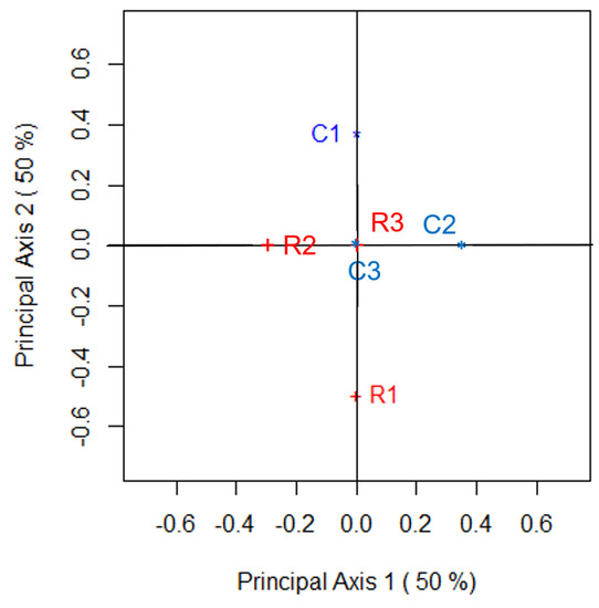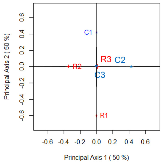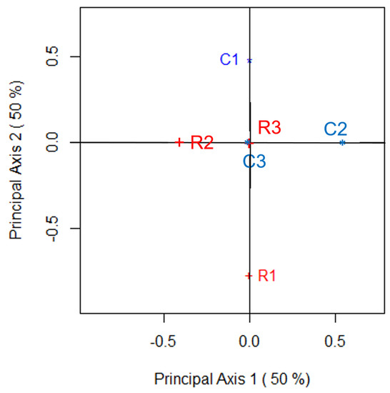 Thus, (23) and (24) satisfy (16) and (17). The zeros in the third and fourth rows of and are because there is perfect symmetry between the third and fourth rows and columns of Table 1. So, the position of these points in the correspondence plot lie at the origin, irrespective of the choice of . When , all principal coordinates for the row and column categories will lie at the origin since Table 1 exhibits perfect symmetry. Therefore, changes in C will lead to changes in the configuration depicted in the correspondence plot. For example, suppose so that, for Table 1, . Then, the key features of the correspondence analysis when an examination of the departures from symmetry are being made using Bowker’s statistic can be simply calculated as follows: