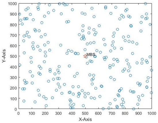 In the actual physical layer network, the actual position of SDN devices with communication function is random and dynamic, and the mapping symmetric OVSs in corresponding virtual networks also have the characteristics of dynamism and randomness. In this paper, we set up a random virtual network for the study of our problem, and the topology of the virtual network is shown in Figure 1. The blue nodes in Figure 1 represent OVSs, and the central location (red ⋆) is the virtual macro base station (MBS) of the virtual network. Additionally, all OVSs in the network transmit the data traffic to the base station through multihop communications.