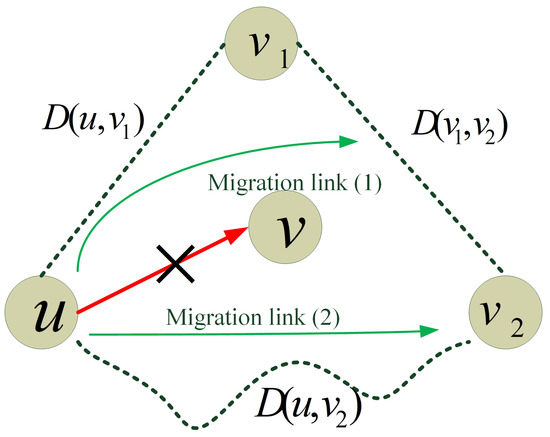 After the data traffic prediction, the traffic prediction value in link is obtained at time t. Next, we compare peak rate with in link . If the traffic in this link satisfies , we do not migrate the data traffic in link ; otherwise, the data traffic needs to be migrated. When predicted traffic in link exceeds peak rate , it is necessary to find a new link in (the neighbors of OVS u), which meets the requirements of traffic and low latency, for replacing to complete the traffic transmission work. In this paper, we use the TIV principle to complete the traffic migration work, which is shown in Figure 3.