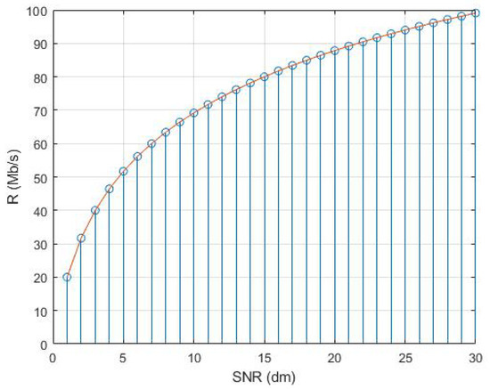 The peak rate of the logical link in the virtual network layer determines the traffic upper limit of the link. Figure 4 shows the peak rate under different SNRs. We can see from Figure 4 that the higher the SNRs are, the higher the traffic upper limit is allowed by the logical link.