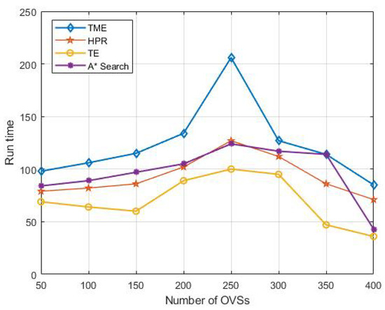 Nonetheless, the proposed TME algorithm always has the longest network run time compared with the HPR, TE and A* Search algorithms. In addition, the maximum value of running time can be reached with 250 OVSs, and the network running time of the proposed TME algorithm can be up to 206 rounds, while of the HPR, TE and A* Search algorithms are 127, 100 and 124, respectively. Obviously, the performance of the proposed TME algorithm is almost improved double that of the other three algorithms. This is because the TME algorithm migrates the links if the predicted traffic exceeds the peak rates, and thus balances the local traffic load and reduces the consumption of energy resources, as well. It is an iterative process from local optimization to global optimization. This process effectively inhibits the excessive energy consumption of OVSs caused by traffic overload of local links and prolongs the service time of all OVSs in the whole virtual network at the same time.