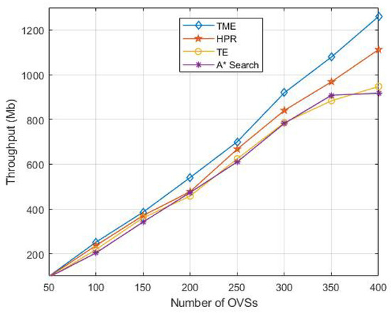 Figure 6 shows the network throughput with different numbers of OVSs in the virtual network. We can see from Figure 6 that the network throughput increases gradually as the numbers of OVS increase. This is because each OVS is responsible for monitoring and transmitting the traffic data, and the traffic increases as the numbers of OVSs increase. Regardless, the network throughput of the proposed TME algorithm is always more than that of the HPR, TE and A* Search algorithms as the number of OVSs increases. The TME controls the loss of traffic and improves the throughput of the network effectively. From the point of view of the network local link, the overloads of data traffic for the HPR, TE and A* Search algorithms can lead to data losses, thus reducing the network throughput.