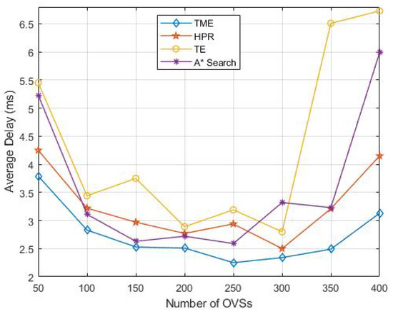 Figure 7 shows the network average delays with different numbers of OVSs in virtual network and the inconsistency of the average delays as the numbers of OVSs increase. We can see from Figure 7 that the minimum delays occur with 250 OVSs in the network for all algorithms, and the reasons are the same as the network run time. The traffic transmission distance will be longer if the number of OVSs is smaller, and the OVS needs much more time to transmit the traffic. The more OVSs there are, the more data traffic needs to be transmitted, which will lead to an increase of time delay. From the point of view of the delay of 5G network, the optimal number of equipment supported by one MBS within 1 km2 in the physical layer is 200–300 in our simulation environment. Regardless, the delay of the TME algorithm is always the lowest and the fluctuation of TME is small at the same time, which also benefits from the migration of local traffic. Migrating the traffic in congested links can significantly improve the quality of data transmission and reduce the delay of data transmission.