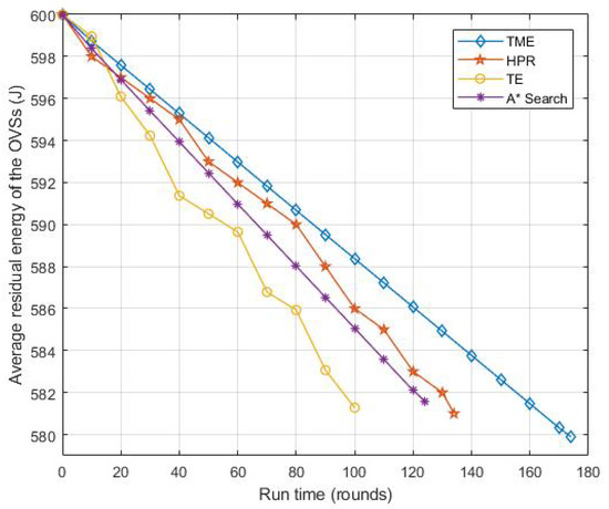 The higher the average residual energy resources of the network is, the better the algorithm is. According to the results in Table 3, the TME algorithm is superior to the other three algorithms.