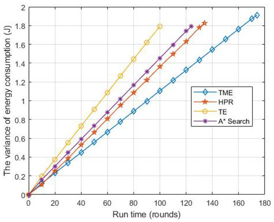 Figure 9 shows the variation of the average residual energy resources of the network as the running time increases. The network will stop when the OVS is damaged or energy resources depletion occurs in the virtual layer. We can see from Figure 9 that the proposed TME algorithm has the most residual energy resources out of the HPR, TE and A* Search algorithms under the same run time. Figure 10 presents the variance of energy consumption as the run time increases. The TME algorithm has the smallest variance, which reflects the balance of energy resource consumption and indicates that the data traffic load of OVSs in the virtual network layer is relatively balanced. This result verifies the effectiveness of the TME algorithm in traffic prediction migration from the perspective of traffic balance, and the reasons are described in detail in Section 4.