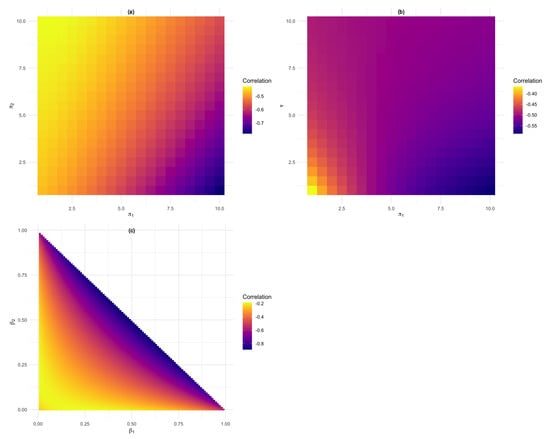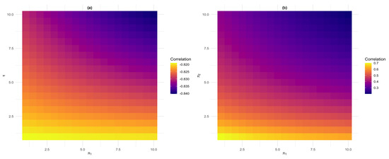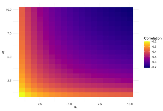 Figure 1 shows how the changes in and affects the correlation for . The heatmap here indicates that positive correlation is not feasible for this model, as is known from the literature (see [4]).