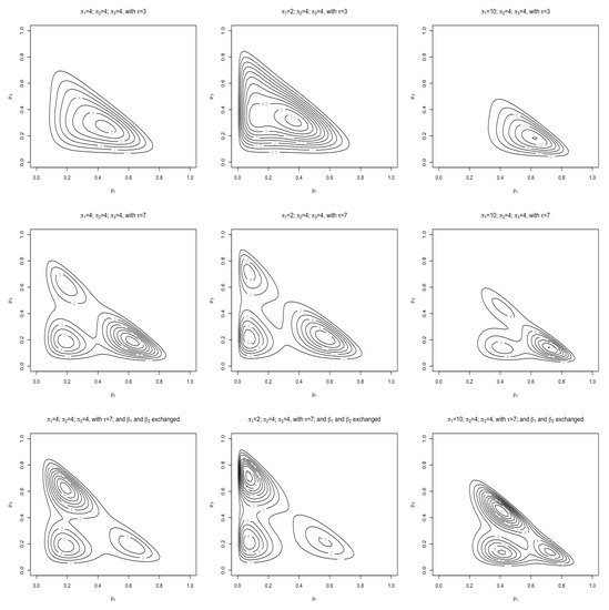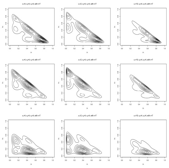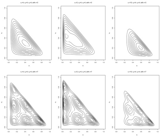 Contour plots for the double flexible Dirichlet distribution (8). This figure shows the effect the value of (changing from 3 to 7) has on the distribution form.