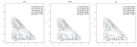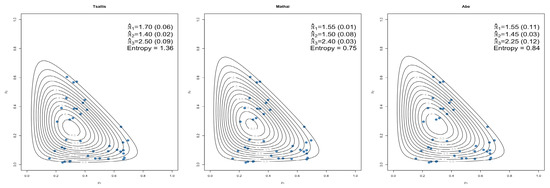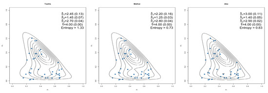 The dataset that was considered, obtained from [15], was collected through household budget surveys aimed at studying consumer demand. This dataset was also used in studies such as [8] and reports the household expenditures (in Hong Kong Dollars) on two commodity groups of a sample of 40 individuals. The variables considered are the proportions spent on housing (including fuel and lights) (), consumables (including alcohol and tobacco) (), and the rest classified as services and other goods (including transport and vehicles, clothing, footwear, and durable goods). The results obtained are reported for for Tsallis, Generalized Mathai and Abe (see Table 1) and visually displayed to illustrate the fitted results.