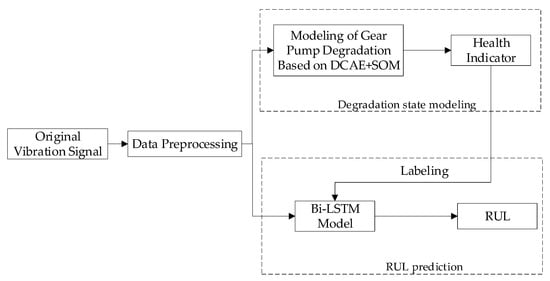 This paper uses a gear pump as the research object. The RUL scheme consists of two segments, as illustrated in Figure 1. The first part represents the steps of modeling the degradation state of the gear pump. By combining a deep convolutional autoencoder (DCAE) with a self-organizing map network, effective feature abstraction of the original vibration signal is used to construct the gear pump health indicator (HI). The second part represents the gear pump life prediction model. The HI values are added as labels to the original data to form the training set, and then the Bi-LSTM model is trained. The output of the model is the prediction of the RUL of the gear pump.