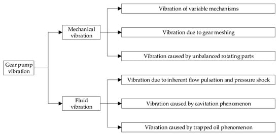 The main failure mode of a gear pump is fatigue and wear, where fatigue failure occurs in the parts that bear repeated alternate loads, and wear failure occurs in the parts that bear repeated friction. The common wear parts of a gear pump are the gear end and floating side plate, tooth and shell inner cavity, gear tooth surface, etc. With the increase in use time, key performance characteristics (such as oil flow back) gradually degrade. When the performance characteristics degrade beyond the predetermined failure threshold, the hydraulic pump fails. Degradation data of key performance characteristics can be used to assess the reliability of hydraulic pumps [32,33]. Gear pumps belong to typical rotating machinery; the structure and fluid will cause the vibration of the gear pump, reflected in mechanical vibration and fluid vibration, as shown in Figure 2. When the device is in a failure state, the quality, stiffness and damping of the system will change, and these changes will be reflected in the vibration signal. This paper analyzes the degradation state and predicts the RUL according to the vibration data of the gear pump.