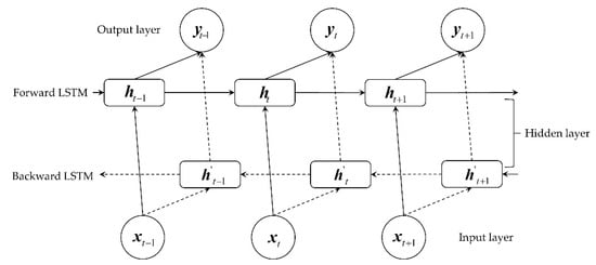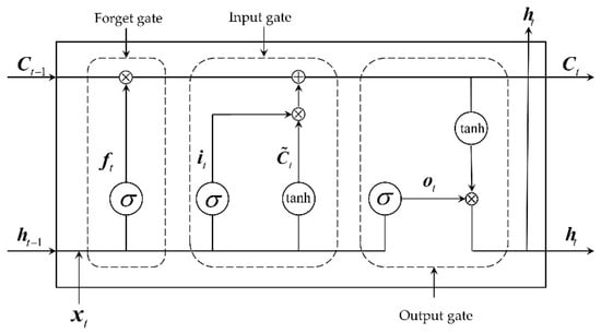 An LSTM network is a peculiar kind of recurrent neural network (RNN) proposed by researchers according to performance requirements [38]. By introducing gating units, LSTM can dynamically change the accumulated time scale to better handle time-series data. In LSTM, , and are the input layer, hidden layer and output layer of the network. At time , its input is not only but also the output of the previous time step . The specific expression is