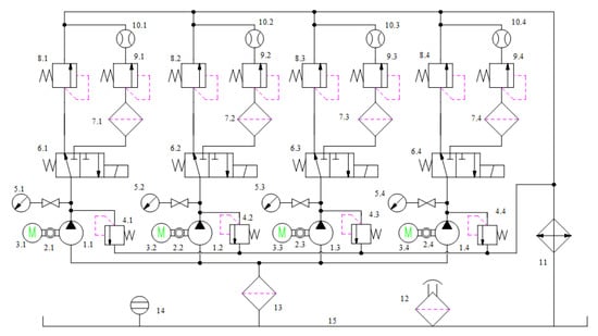 Schematic diagram of the constructed test bench: 1—gear pump; 2—torque speed meter; 3—motor; 4—safety valve; 5—pressure gauge; 6—magnetic exchange valve; 7—high-pressure filter; 8—high-pressure relief valve; 9—low-pressure relief valve; 10—flowmeter; 11—cooler; 12—air filter; 13—suction filter; 14—liquidometer; 15—oil tank.