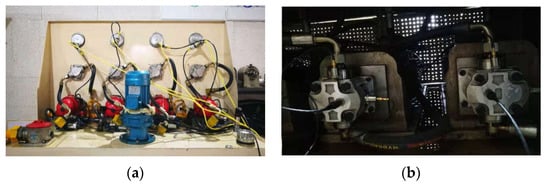 This life acceleration test bench was used to conduct experiments on 4 gear pumps of the same type at the same time. The sensors installed in the test include torque sensors, flow meters and acceleration sensors to monitor and collect changes in torque, rotational speed, output flow and vibration throughout the life test. The test bench can make the gear pump work under non-rated conditions so that the gear pump accelerates its wear and degradation. The change in pumps’ pressure is mainly controlled by the low-pressure relief valve. The schematic diagram of the gear pump accelerated life test bench system is illustrated in Figure 4.