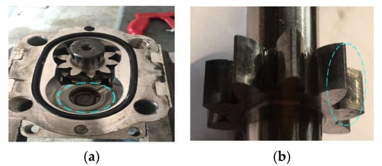 Wear and tear of gear pump: (a) side plate wear; (b) end-face wear of driving gear.