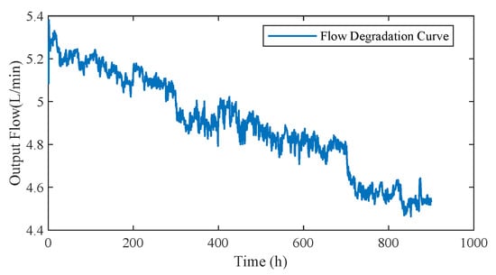 The tested gear pump was disassembled after the test. It can be observed that the gear pump has obvious wear, as illustrated in Figure 6. The failure mechanism of the tested gear pump is wear, which leads to an increase in internal leakage and a decrease in volumetric efficiency. The flow degradation curve of the tested gear pump is shown in Figure 7. The output flow of the tested gear pump decreases significantly with the extension of running time. The flow rate of the gear pump decreases slowly in the early stage of operation and gradually accelerates in the later stage of operation until the failure threshold is reached. According to the wear condition and flow degradation curve, the experimental data are consistent with the degradation law of the initial wear stage and the stable wear stage.