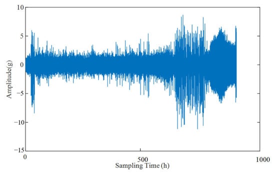 In the experiment, each pump collected vibration signals in three directions: X, Y and Z. The vibration data of one pump were selected for analysis. Of the three directions, the Z direction has the largest amplitude. Considering that the end-face wear is the main wear form of the gear pump, the data in the Z direction were selected as the usage data in the vibration data. The vibration curve of one pump is shown in Figure 8.