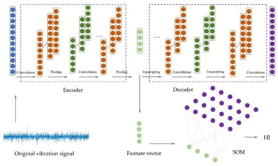 This paper reflects the degradation status of gear pumps by constructing their HI. During the construction of HI, effective feature abstraction of the original data is required to explore its more in-depth representation. Multiple valid characteristics are combined to create a degradation curve reflecting the health of the gear pump. Figure 9 is the flow chart for obtaining the gear pump HI. Firstly, the original vibration signal is segmented, and the segmented data are directly input into the DCAE. In this paper, the one-dimensional convolutional kernel was selected to improve the coding network with respect to the characteristics of the vibration signal. During the experiment, it was found that the one-dimensional convolutional kernel enables efficient feature extraction of the vibration data as a time series. The decoding network consists of one-dimensional convolution layers and upsampling layers. The upsampling layer is represented as: