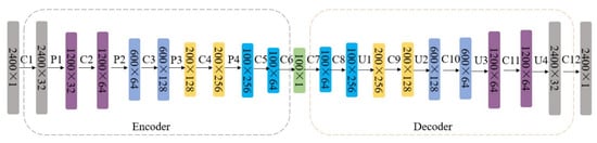 Step 2: DCAE model training. In the encoder, there are six convolutional layers, and the number of convolutional kernels in every convolutional layer is: 32, 64, 128, 256, 64, 1. The maximum pooling layer is added after each convolution layer. In the decoder, there are six convolution layers, and the number of convolution kernels in every convolution layer is: 64, 256, 128, 64, 32, 1. The convolution kernel size of every convolution layer is 3 × 1. The size of the maximum pooling layer is 2 × 1. After each convolution layer, the ReLU function is used to activate it. The learning rate of the model is 0.001, and the optimizer is Adam. The batch size is 64. All of the test models mentioned in this paper were calculated by two GPUs, and the model was GeForce RTX 3090. The structure of the DCAE is indicated in Figure 10, where P1–P4 denotes the pooling layer, U1–U4 denotes the upsampling layer, and C1–C12 denotes the convolution layer.