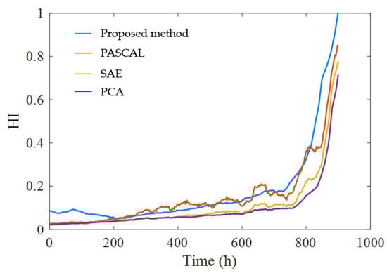 Three other methods were selected to compare with the proposed method, and the evaluation index was selected for quantitative analysis. The first method is named principal component analysis (PCA), and it extracts time-domain characteristics and frequency-domain characteristics from the data. These include skewness, center of gravity frequency, kurtosis, variance, margin index, peak value, root mean square frequency, waveform index, peak-to-peak value and frequency standard deviation. The 10 features derived were subjected to principal component analysis to obtain the state degradation curve of gear pumps. The algorithm in this paper was used as the second method [39], named stacked autoencoder (SAE). The third method was used in [40], named PAirwiSe CompArison Learning (PASCAL). The HI curves constructed based on the gear pump data with the four methods were compared. The HI curves constructed by the four methods are illustrated in Figure 12.