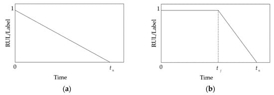 where is the initial degradation time of the equipment. In Figure 14b, the health level remains unchanged until time point . This method is not accurate enough. Firstly, in complex data, critical inflection points are difficult to find accurately; secondly, in the labeling method based on the piecewise function, the equipment degradation rate at different stages is also kept constant. In the early stage of equipment operation, slight changes in the equipment are ignored; during the accelerated degradation phase, the degradation rate of the equipment is clearly not constant. There are some problems in the models trained by these two methods. The RUL curve obtained by the model often fluctuates greatly, because the same label value is added to some data of different states. The training results of some models seem to be good, but they only accurately predict the label values, which are actually inconsistent with the real situation, leading to the poor generalization ability of the models.