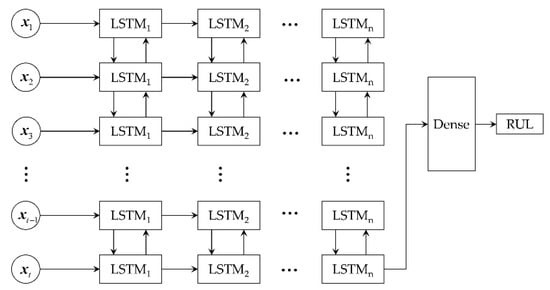 The gear pump produces a large amount of data during its whole life cycle, and the data type is a one-dimensional continuous vibration signal, so the LSTM-based model was selected for RUL prediction. As degraded equipment, the gear pump has a strong correlation with the vibration data. LSTM can mine the information from the front to the back of the memory time series very well, but it fails to use the future information of the data, and the correlation analysis between the data is lacking. Therefore, this paper constructs a bidirectional long short-term memory (Bi-LSTM) network. The basic idea of Bi-LSTM is to add an additional layer of LSTM units, which is equivalent to re-calculating the input sequence inversely. The final result is a simple combination of the results of the two-layer LSTM network. Its structure is illustrated in Figure 15. The hidden layer state of Bi-LSTM at time is