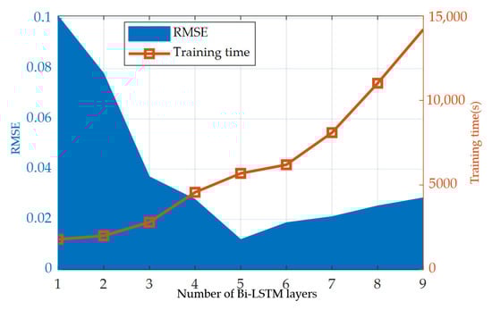 The experiment found that in the training of the Bi-LSTM model, the most influential factor on the training results is the number of Bi-LSTM layers. For the purpose of investigating the effect of the number of Bi-LSTM layers on the prediction results, models with one to nine layers of Bi-LSTM were selected for tests, and the RMSE value of the test results was used as the evaluation index.