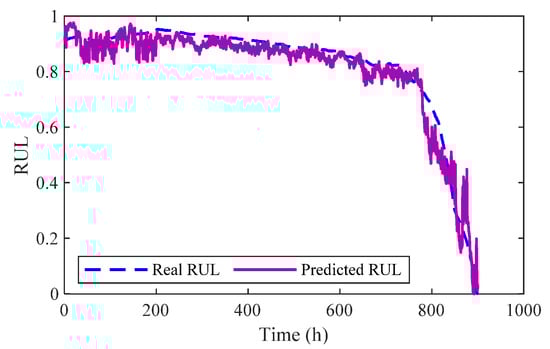 Figure 17 shows the experimental results. When the number of Bi-LSTM layers is 1, 2, 3 and 4, the RMSE value is larger. When the number of Bi-LSTM layers is 5, the prediction effect of the model is the best. However, after five layers, the RMSE value of the predicted results tends to increase with the number of layers. At this point, the curves of training loss and verification loss in the training process were observed. The loss continued to decline until convergence, but the verification loss tended to remain constant after rising. This indicates that the model at this time has overlearned the training set, leading to overfitting and thus a continuous decline in the model’s generalization ability. Additionally, with the increasing number of Bi-LSTM layers, the training time increased significantly. Therefore, based on the above factors, the number of Bi-LSTM layers in this model was set at 5. The life prediction results of one gear pump are shown in Figure 18. It can be appreciated that the predicted RUL values match the actual RUL curves better.