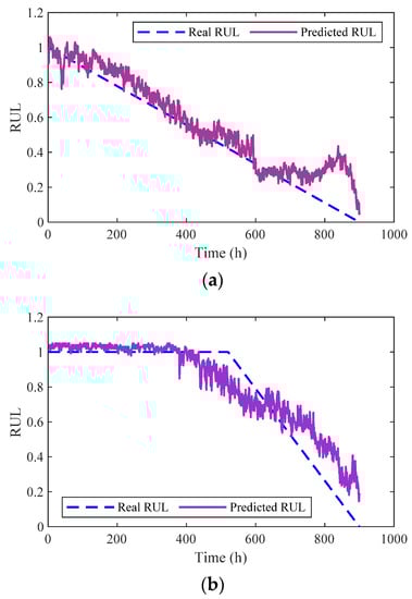 RUL prediction results of the two methods: (a) Method 2; (b) Method 3.