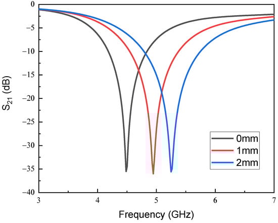 In addition, we find that the object to be measured moves on a 2D plane, and its movements could be decomposed into horizontal x and vertical y directions. The displacement in the x-direction will drive the horizontal movement of the mover in the CSRR in the x-direction, causing the change in the slit value of CSRR in the x-direction. Similarly, the movement in the y-direction will also cause a change in the slit value of the CSRR in the y-direction. However, some errors may be caused here. Taking the y-direction as an example, the movement in the x-direction will cause the mover of the CSRR in the y-direction to move in the horizontal direction, and the resonance point of the CSRR structure will not only be affected by the slit width but is also slightly affected by the position of the slit, as shown in Figure 6.