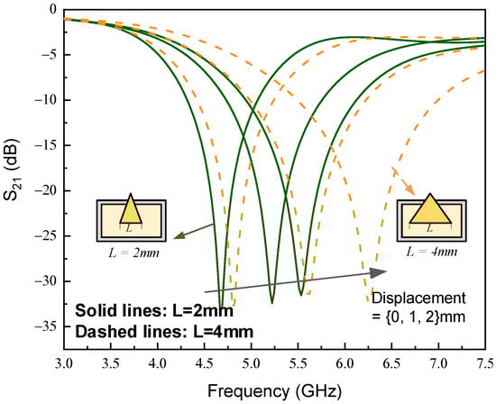 Since the resonant frequency of the CSRR is highly dependent on the structural parameters, it is expected that the mover’s movement could be retrieved by the variation in the resonant frequency. As shown in Figure 3, when the mover moves upward, the value of increases, thereby inducing an upward shift of resonant frequency. As displacement of the mover increases from 0 to 2 mm, the resonant frequency increases from 4.48 GHz to 5.25 GHz, corresponding to a sensitivity of 382 MHz/mm. Further, the influence of mover’s triangle base length on the sensor response is examined. As shown in Figure 4, as increases from 2 mm to 4 mm, the sensor sensitivity can be improved significantly.