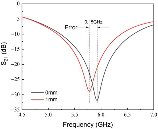 We performed a simulation analysis of the error here. We set the CSRR size to 5 mm × 3 mm, the slit width to 0.8 mm, and the bottom side of the triangle mover to be 4 mm long and 4 mm high. As shown in Figure 7, the measurement error caused by a lateral movement of 1 mm is 0.15 GHz. This lateral error has no linear relationship with the lateral displacement. When the lateral displacement is small, there is almost no lateral error, while when the lateral displacement is large, the lateral error will increase a lot.