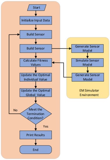 For the structure of the CSRR 2D displacement sensor proposed above, it is difficult to obtain the best parameter combination through the analytical expression of the CSRR structure to achieve a small error in the 2D measurement. To find the parameter combination with the smallest error in the design space, this paper uses the particle swarm optimization algorithm to find the solution with the smallest error in the design space. The workflow is shown in Figure 9.
