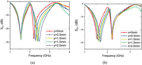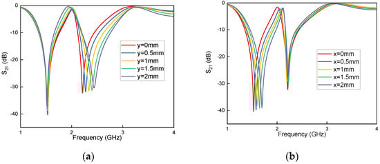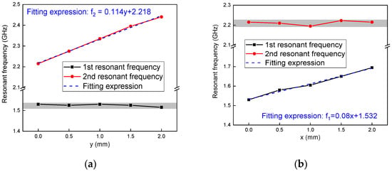 The structure of this optimized 2D sensor is simulated and analyzed. The influence of the horizontal and vertical displacement on the CSRR resonance point are shown in Figure 10a,b. The error in the horizontal or vertical direction is very small, the resonance point used to measure the horizontal displacement is unchanged when the mover is displaced vertically, and the resonance point used to measure the vertical displacement is at the horizontal position of the mover. It remains unchanged during displacement. The different loss functions of the final optimization results of the algorithm may be quite different. The goal here is to optimize the error value of the sensor in the 2D measurement, and this error value is defined as the sum of the resonant frequency offsets of 1 mm and 2 mm of lateral movement in the x and y directions, respectively. The simulated results are shown in Figure 11. The relationship of the resonant frequency and the displacement is linear, while another resonant frequency is nearly unchanged. Here, the quality factor is defined as the ratio of resonant frequency and 3 dB bandwidth. The quality factors of the first and second resonances are 80.8 and 83.6, respectively.
