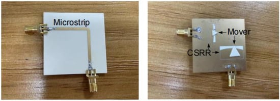 It is expected that the 1D displacement sensor can be extended to sensing the 2D displacement. As shown in Figure 5, two rings are etched on the ground plane, and two movers are attached to form CSRR structures. In order to distinguish the displacements in two directions, the geometrical parameters of two CSRRs are different, thereby producing two resonant frequencies. Here, the sizes of two CSRRs are denoted by and , respectively. In the applications, two movers are simultaneously bonded to the object under test. It is anticipated that the position of the object under test could be obtained by the combinations of the variations in two resonant frequencies. To excite both CSRRs in different directions, the microstrip line is designed with a 90° bend, and the corner is cut to reduce parasitic capacitance.