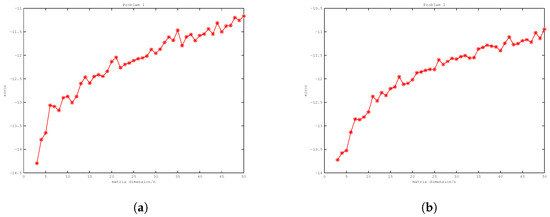 Example 3. Suppose be generated randomly for . Denote Compute and . For and , using Algorithms 1 and 2, we can obtain the calculation solutions and , respectively. Denote , . As the dimension changes, are shown in Figure 1. | Algorithm 1: (Problem 1) |