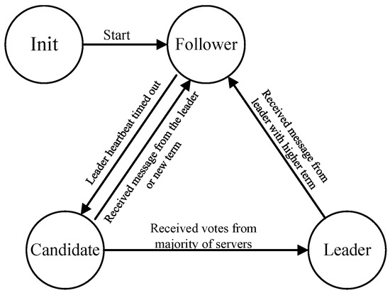 In the Raft algorithm, the server has three states: Leader, Candidate, and Follower (Figure 1). Their state transition is controlled by random timeout, and each server is in these three states at any time. Each state has different operations. The Leader processes client requests forwarded by other servers and sends log entries required by each Follower. If the log entries are empty, the Leader sends heartbeat packets. The Candidate sends a vote request RPC to other servers until more than half of the responses are received or the timer times out again to enter the election of the next term. When the Candidate receives a legitimate heartbeat packet from the Leader, the Candidate will return to the Follower state. The Follower responds to a vote request sent by a Candidate and sends a vote request response to a Candidate. It also responds to requests from the Leader, and if the request contains log entries, the log will be safely added to the local state machine, and the result of processing will be sent to the Leader.